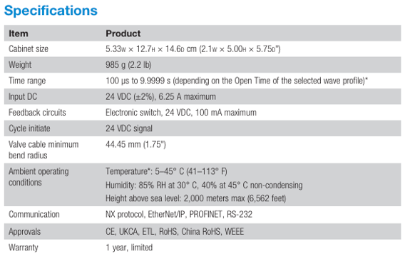 TCP/IP를 통한 NX 프로토콜 • 제트 밸브의 간편한 설정, 프로그래밍 및 모니터링을 위한 직관적인 웹 인터페이스 • 기존 기계 캐비닛에 맞는 DIN 레일 구조 • 24V 플러그 앤 플레이 호환 |